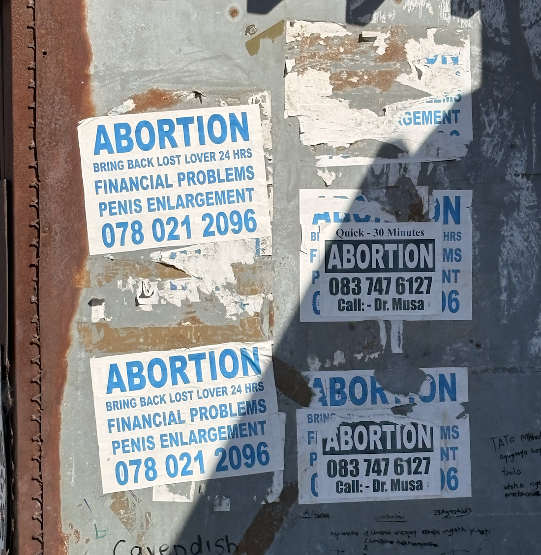 Door heel Langa zag ik dezelfde witte poster met lichtblauwe letters: Penis enlargement, abortion and bring back lost lovers. En daaronder een telefoonnummer.